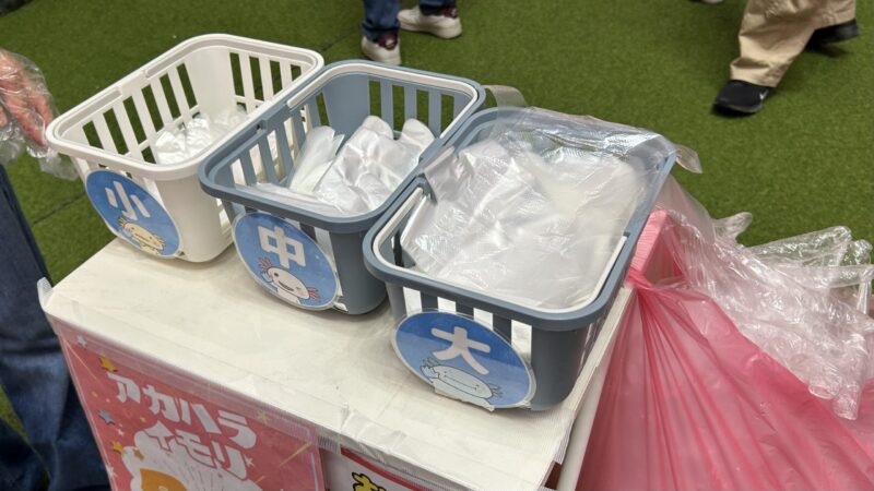 生き物を触るときはビニール手袋をつけて触ります。会場にビニール手袋(大・中・小)が置いてあるので、手を拭いたりする必要はありませんでした。